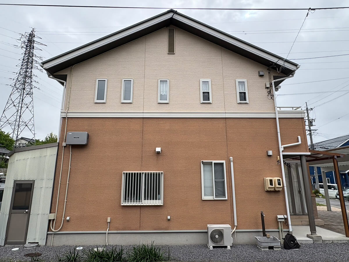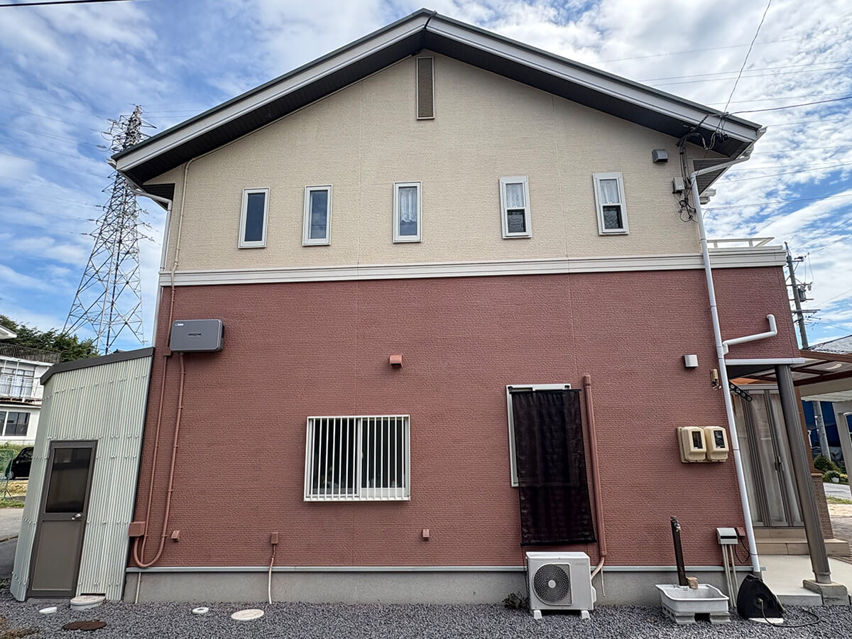 既存の外壁は、長年の経過で全体的にくすみや汚れが気になり始めていました。特に濃い色の下部(赤茶色)は色褪せや埃の付着が進行し、建物全体が古く暗い印象に。建物本体を守る塗膜の防水機能の低下も懸念される、塗り替えが必要な状態でした。